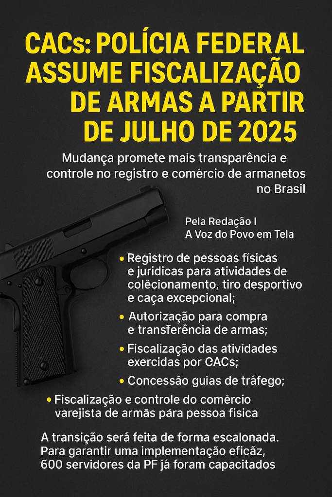 partir de 1º de julho de 2025, entra em vigor a nova política nacional de controle de armas, que transfere integralmente para a Polícia Federal a responsabilidade pela fiscalização de colecionadores, atiradores desportivos e caçadores — o público conhecido como CACs.