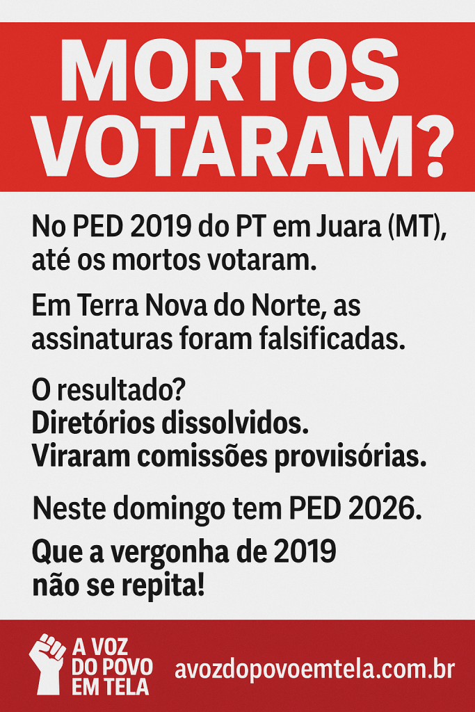 Juara e Terra Nova do Norte protagonizaram escândalos eleitorais tão vergonhosos que a Direção Nacional do PT não teve escolha: dissolveu os diretórios e transformou-os em comissões provisórias. Agora, às vésperas do PED 2026, a pergunta é: será que os vivos finalmente vão assumir o controle?