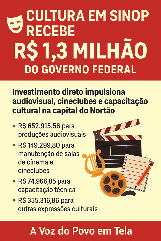 Com mais de R$ 1,2 milhão garantidos para a cultura, Sinop ganha a oportunidade de ampliar sua cena artística, fortalecer o audiovisual e democratizar o acesso à arte. Cabe agora ao município garantir editais transparentes e gestão eficaz para transformar esse recurso em impacto social.ovo em Tela