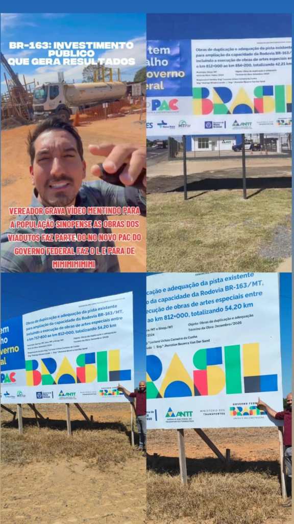 Não caia na conversa de quem mente em vídeo para se promover. A duplicação da BR‑163 e os viadutos em Sinop são 100% federais, frutos do Novo PAC, executados pela Nova Rota do Oeste e supervisionados pela ANTT/DNIT. A lâmina da placa não mente: a obra não é do estado, é do povo brasileiro via governo federal.