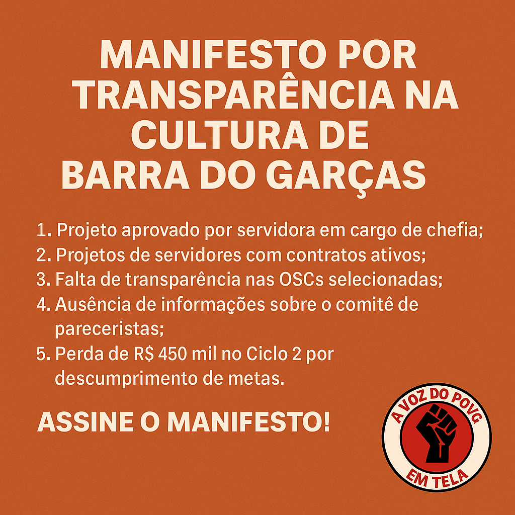 Artistas, produtores e trabalhadoras da cultura de Barra do Garças (MT) assinaram um manifesto público exigindo explicações formais da Secretaria Municipal de Cultura, do Instituto Mutirum (organização da sociedade civil executora da PNAB no município), e do comitê de pareceristas responsável pela seleção dos projetos da Política Nacional Aldir Blanc (PNAB) – Ciclo 01.