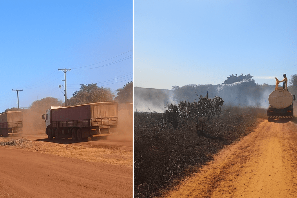 Caminhões levantam nuvens de poeira em ruas não asfaltadas e focos de incêndio se espalham por terrenos baldios próximos ao hospital e bairros residenciais. População cobra providências urgentes.