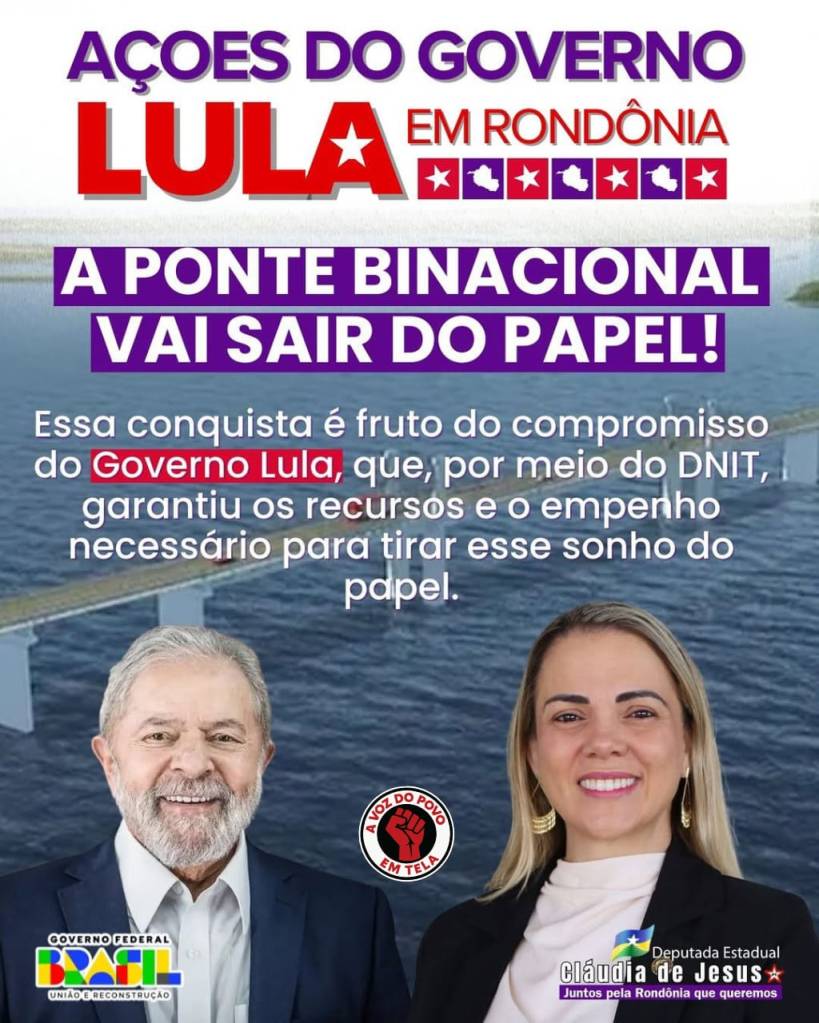 Com a assinatura do contrato prevista ainda para 2025, as obras devem iniciar até o primeiro semestre de 2026. Um século depois de sua concepção original, a Ponte Binacional finalmente se tornará realidade — graças à força do Governo Lula e à incansável atuação da deputada Cláudia de Jesus, que transformou promessas em conquista real para o povo de Rondônia.