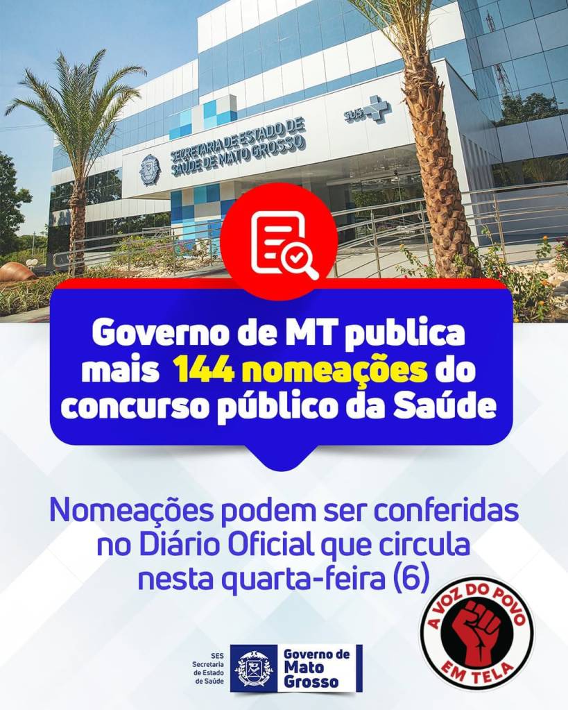 O Governo de Mato Grosso publicou no Diário Oficial do Estado, que circula nesta quarta-feira, 6 de agosto de 2025, a nomeação de 144 profissionais aprovados no Concurso Público da Secretaria de Estado de Saúde (SES). Os nomeados vão reforçar as equipes do Hospital Regional de Sorriso e da estrutura administrativa do nível central da SES, em Cuiabá.