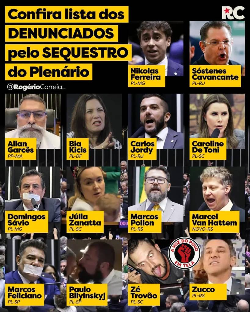 A lista da vergonha segue com Sóstentes Cavalcante (PL-RJ), Nikolas Ferreira (PL-MG), Zucco (PL-RS), Allan Garcês (PL-TO), Caroline de Toni (PL-SC), Marco Feliciano (PL-SP), Bia Kicis (PL-DF), Domingos Sávio (PL-MG) e Carlos Jordy (PL-RJ). Uma verdadeira tropa de choque contra o bom senso.