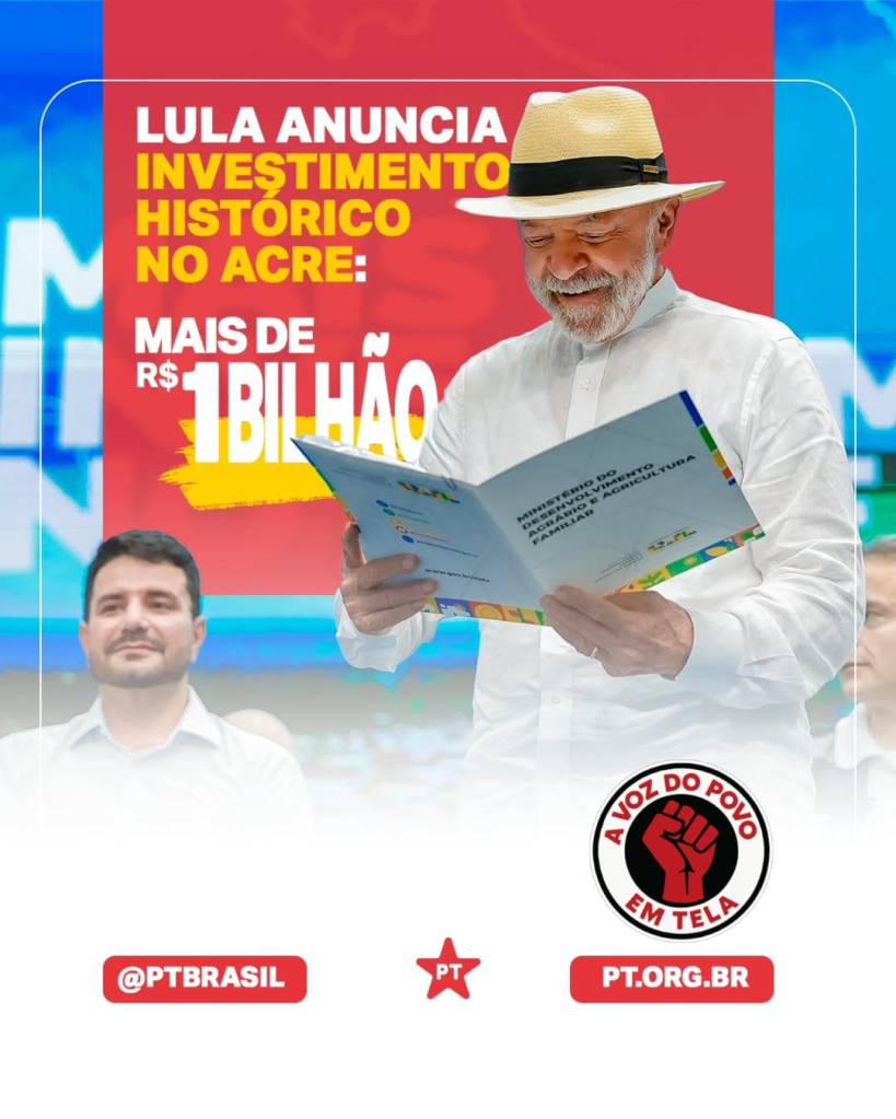 O Acre amanheceu, neste domingo, com um anúncio histórico vindo diretamente do presidente Luiz Inácio Lula da Silva: mais de R$ 1,1 bilhão em investimentos para impulsionar a infraestrutura, o transporte, a energia, a educação e a regularização fundiária do estado.
