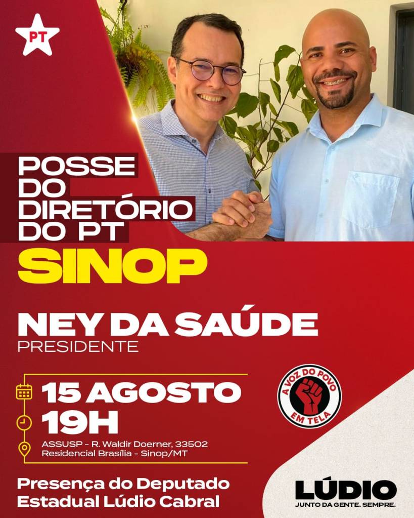 O Partido dos Trabalhadores de Sinop viverá um momento histórico no próximo 15 de agosto, às 19h, com a posse do presidente eleito Ney da Saúde e dos membros que irão compor o novo Diretório Municipal. A nova direção é fruto de uma composição entre as chapas Movimento PT 650 e Construindo um Novo Brasil CNB 680, garantindo maior representatividade interna e fortalecendo a unidade partidária diante dos desafios políticos e sociais.