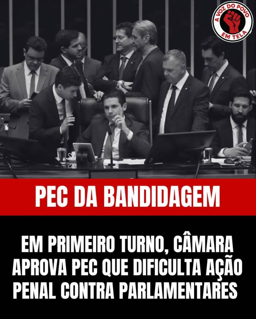 Na noite de 16 de setembro de 2025, a Câmara dos Deputados deu o primeiro passo para institucionalizar a impunidade. Em primeira votação, a chamada PEC da Blindagem foi aprovada por 353 votos a favor, liderados pela bancada bolsonarista e seus aliados do centrão, contra 134 votos que rejeitaram a manobra e 1 abstenção. Ainda falta o segundo turno para que o texto avance ao Senado, mas o recado já foi dado: a tropa bolsonarista corre para se blindar da Justiça.