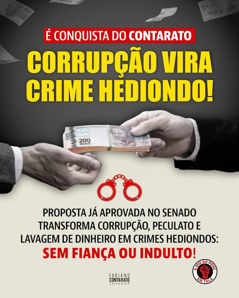 A corrupção no Brasil sempre foi tratada com a complacência de um sistema que absolve ricos e pune pobres. Enquanto os poderosos desviam bilhões, o povo espera por leitos de hospital, escolas decentes e saneamento básico. Mas um novo capítulo começou a ser escrito com a aprovação no Senado do projeto de lei do senador Fabiano Contarato (PT-ES), que transforma os crimes de corrupção, peculato e lavagem de dinheiro em crimes hediondos.