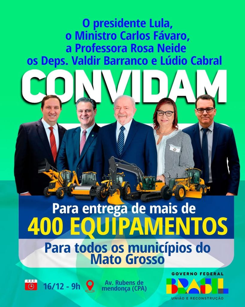 O Governo Federal vai realizar no dia 16 de dezembro, às 9h, na Avenida Historiador Rubens de Mendonça (CPA), em Cuiabá, a maior entrega de maquinário já feita em Mato Grosso: mais de 400 máquinas e equipamentos destinados a todos os 142 municípios do estado. A ação integra o Programa Nacional de Modernização e Apoio à Produção Agrícola (Promaq), coordenado pelo Ministério da Agricultura e Pecuária (MAPA), e representa um avanço histórico na capacidade operacional das prefeituras.